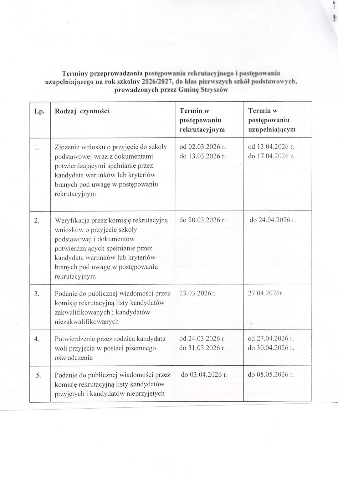 Wypełnione formularze należy złożyć w sekretariacie Zespołu Szkolno-Przedszkolnego im. św. Jana Pawła II w Stryszowie w nieprzekraczalnym terminie od 2 marca 2026 r. do 13 marca 2026 r.